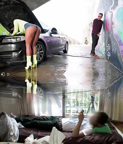 Blonde girl Angie Lynx inhaling a rock hard cock after washing a car