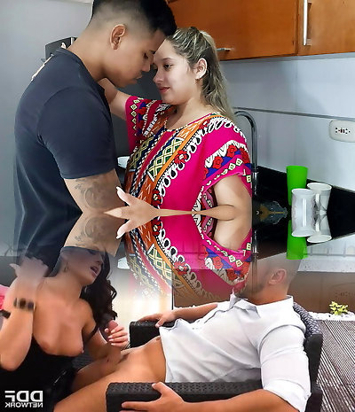 Posh big-boobed wife cheating in front of hubby with lucky hung guy