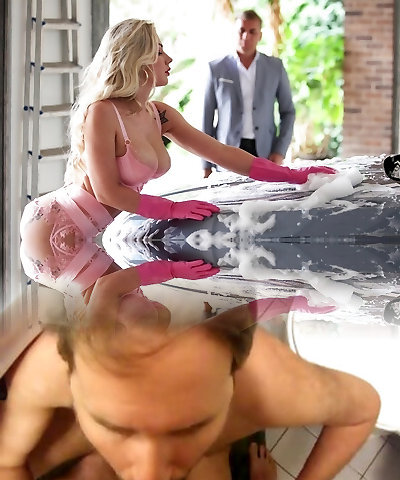 Blonde girl Angie Lynx inhaling a rock hard cock after washing a car