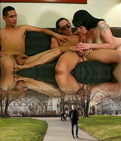 Brunette bi-atch and stud with tattoos poke bisexual stud in glasses