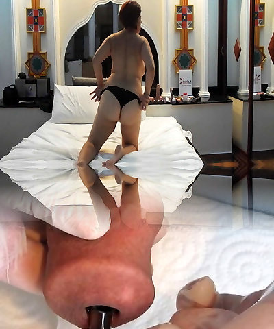 Bitch with butt-plug and fake bra-stuffers attempts anal and cums in the kitchen